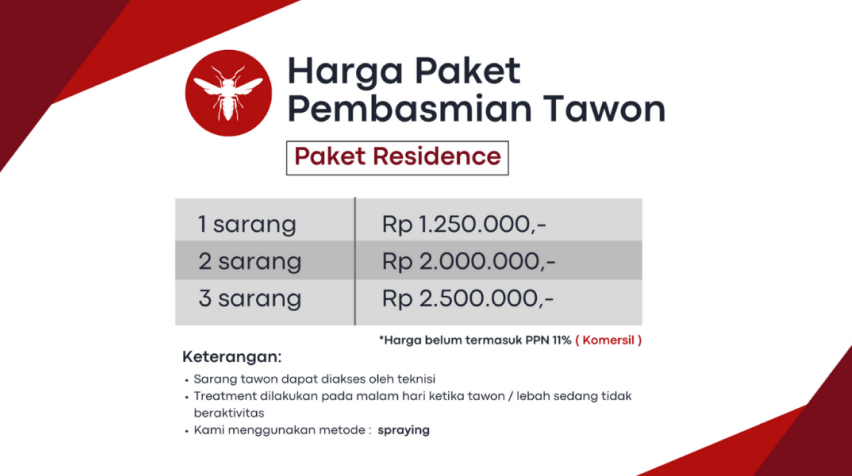 Berdasarkan hasil inspeksi, teknisi kami akan menentukan metode pembasmian yang paling efektif. Kami menggunakan metode spraying dan juga cold fogging untuk memastikan semua tawon di rumah Anda terbasmi. Bahan kimia yang kami gunakan telah disetujui oleh otoritas kesehatan dan aman untuk digunakan di lingkungan rumah tangga.